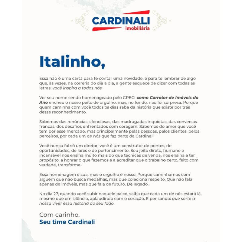 Com visão empreendedora e dedicação ao setor, Italinho transformou a Imobiliária Cardinali em uma das maiores da região. A empresa se destacou especialmente no segmento de lançamentos imobiliários, firmando parcerias com grandes construtoras e expandindo sua atuação para cidades como Araraquara, Ibaté, Campinas, Itirapina e Ribeirão Preto. Atualmente, a Cardinali conta com quatro unidades em São Carlos.