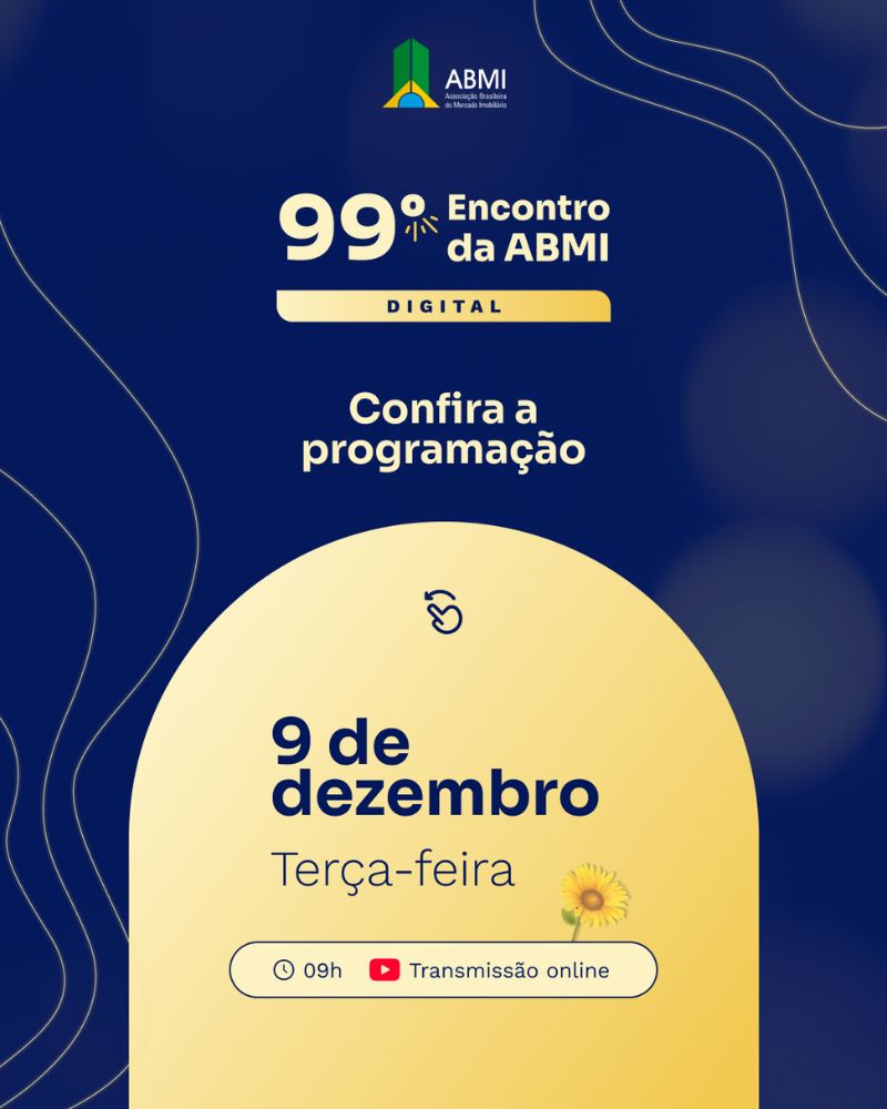 O 99º Encontro da ABMI, em versão digital, será realizado nesta terça-feira, 9/12/25, das 9h às 12h, com transmissão ao vivo pelo YouTube. Exclusivo para dirigentes e colaboradores das empresas associadas, o evento encerra o calendário anual da Associação Brasileira do Mercado Imobiliário em um formato leve, festivo e cheio de significado.